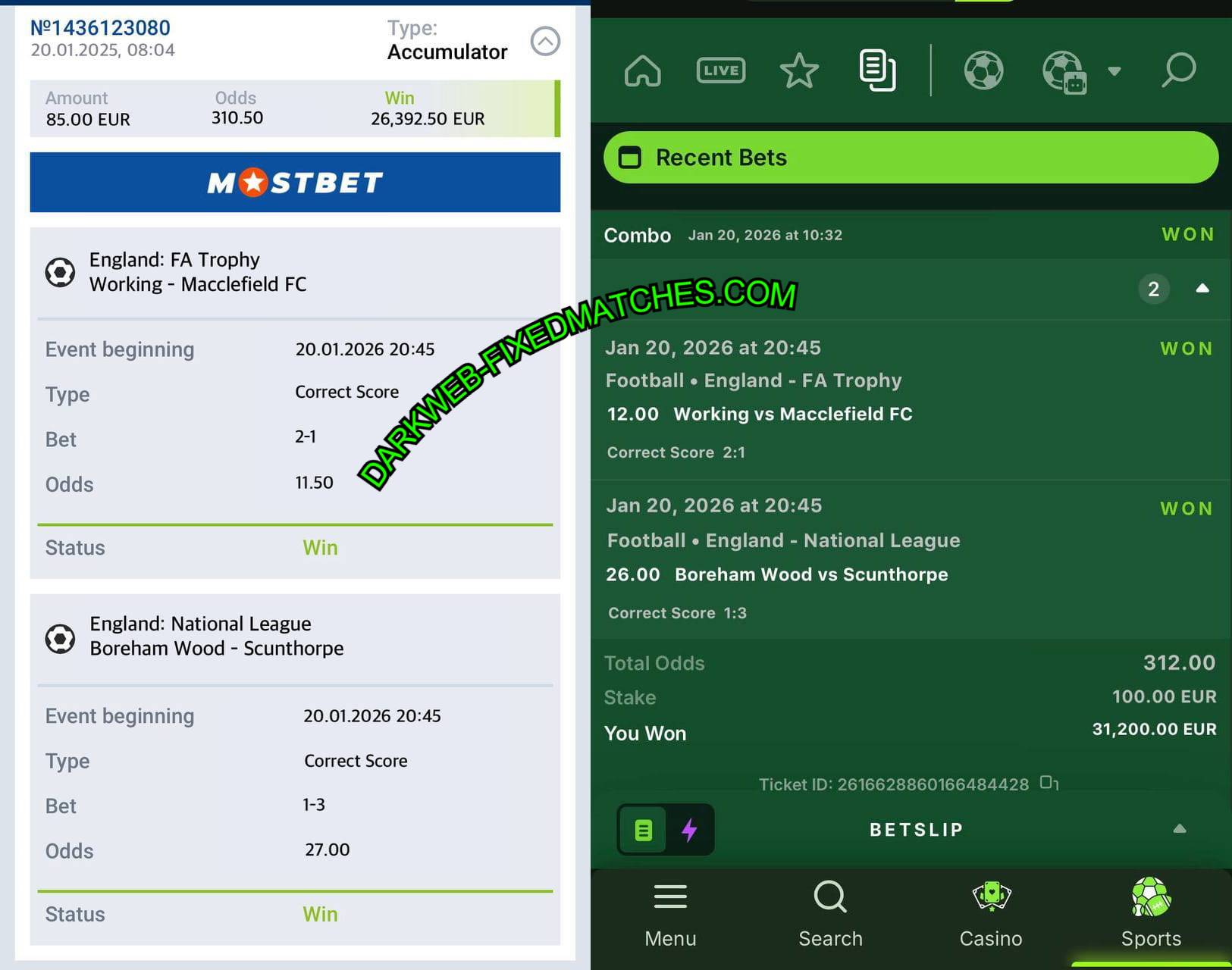 NEW MOBILE SCREENSHOTS OF MULTIPLE BOOKMAKERS PROOFS FROM – 20/01/2026 (TUESDAY) 312.00 ODDS WON